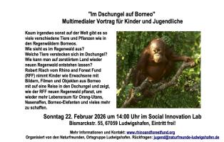 Robert Risch vom Rhino and Forest Fund (RFF) nimmt Kinder und Jugendliche mit Bildern, Filmen und Objekten aus Borneo mit auf eine Reise in den Dschungel und zeigt, wie der RFF neuen Regenwald pflanzt, um wieder mehr Lebensraum für Orang-Utans, Nasenaffen, Borneo-Elefanten und vieles mehr zu schaffen.